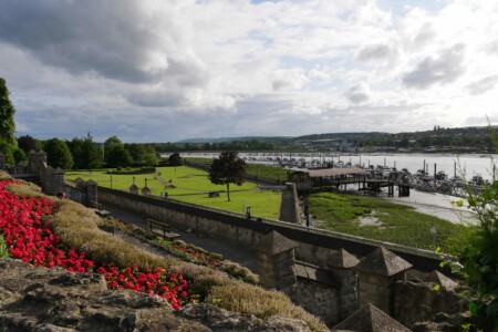 Nous descendons la rue principale très vivante, aux allures de village des années 50. En effet : l’architecture en briques, les boutiques d’antiquaire, les enseignes et le pont, nous transportent dans un autre temps. D’où que nous soyons, nous ne pouvons passer à côté de l’immense château et de ses longs remparts. Nous marchons dans la ville basse et passons même devant des terrains de « bowls » (un peu comme du bowling d’extérieur).
