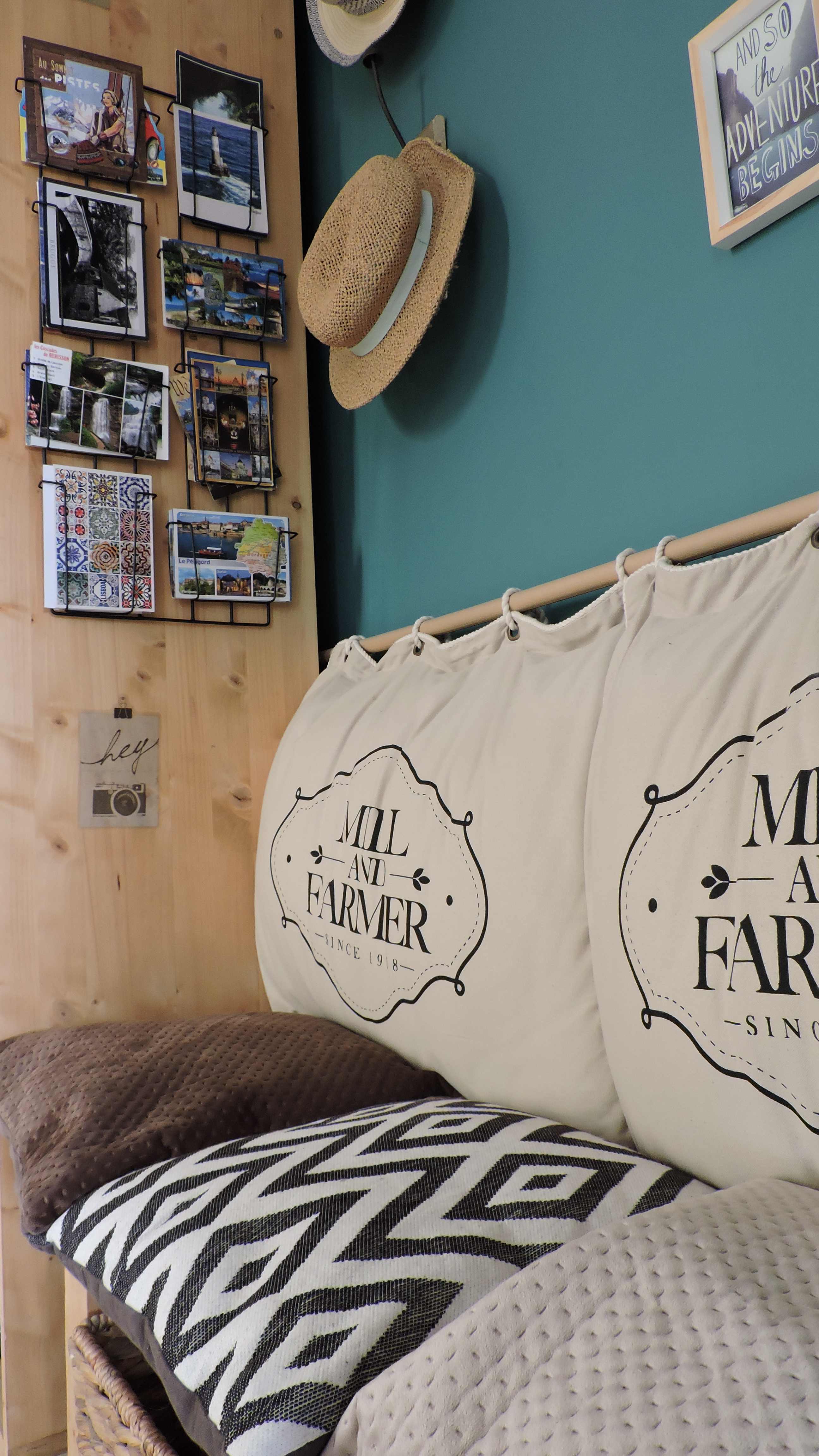 La grande MapMonde est mon point de départ pour le thème de l’entrée : Le voyage. En ce qui concerne la couleur bleu dominante (eucalyptus), j’ai tout simplement repris la couleur que j’avais choisi pour le salon-cuisine-salle à manger (il y a un rappel derrière la cuisine aménagée).